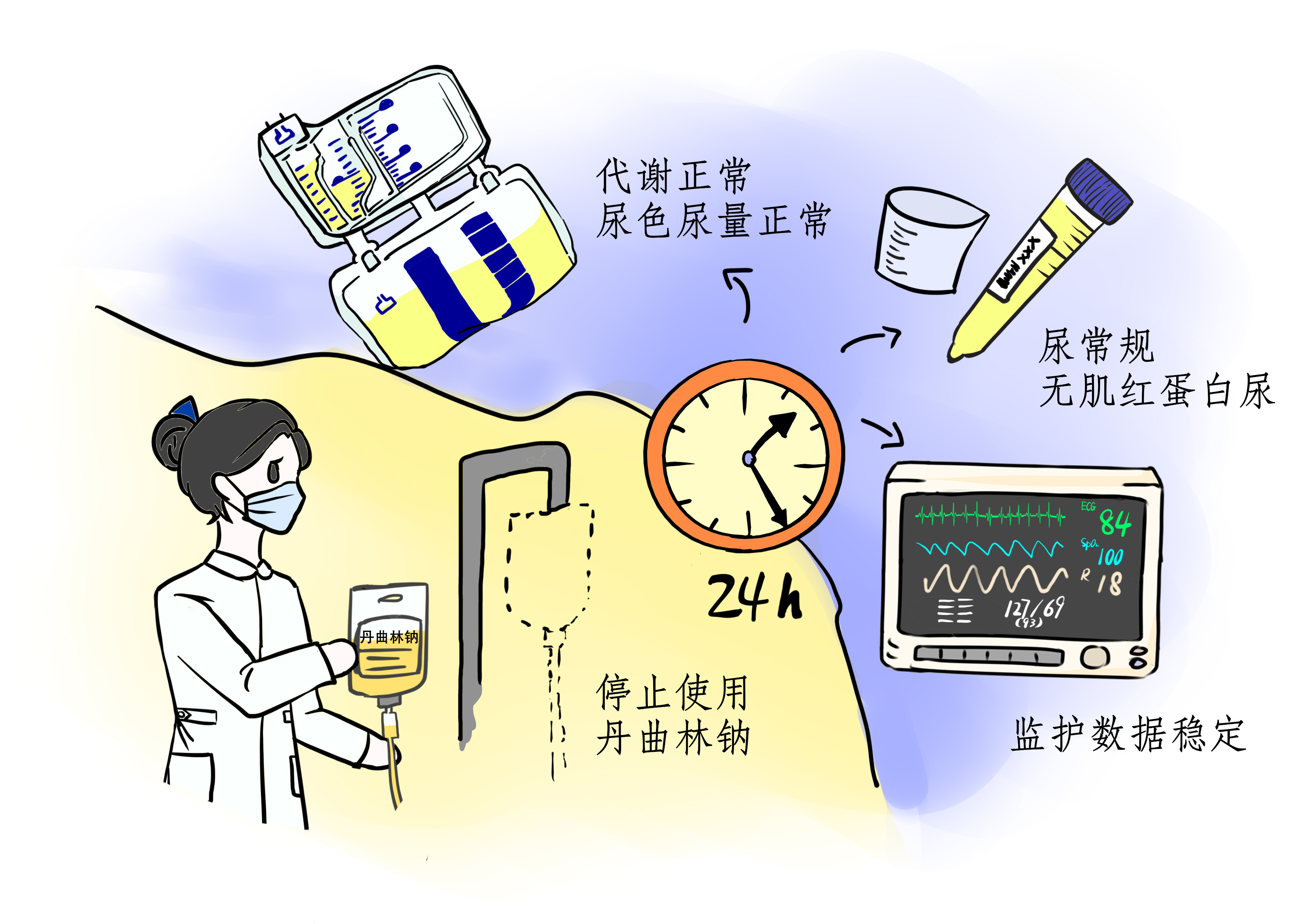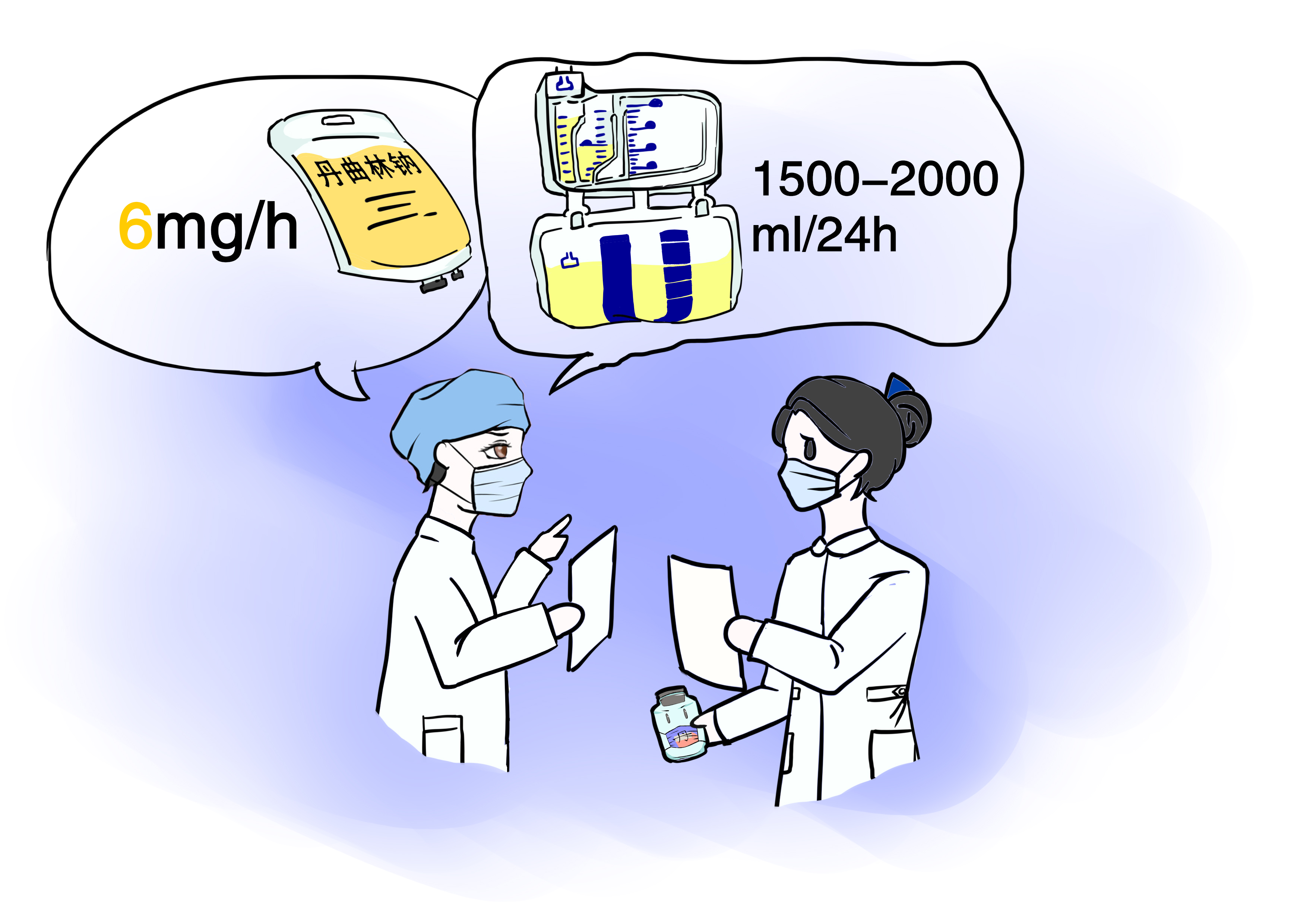 麻醉科医生向病房护士交待术中病情变化,嘱丹曲林钠仍需以6mg/h(0.25mg/kg/h)静脉持续输注24 h,继续监测生命体征变化