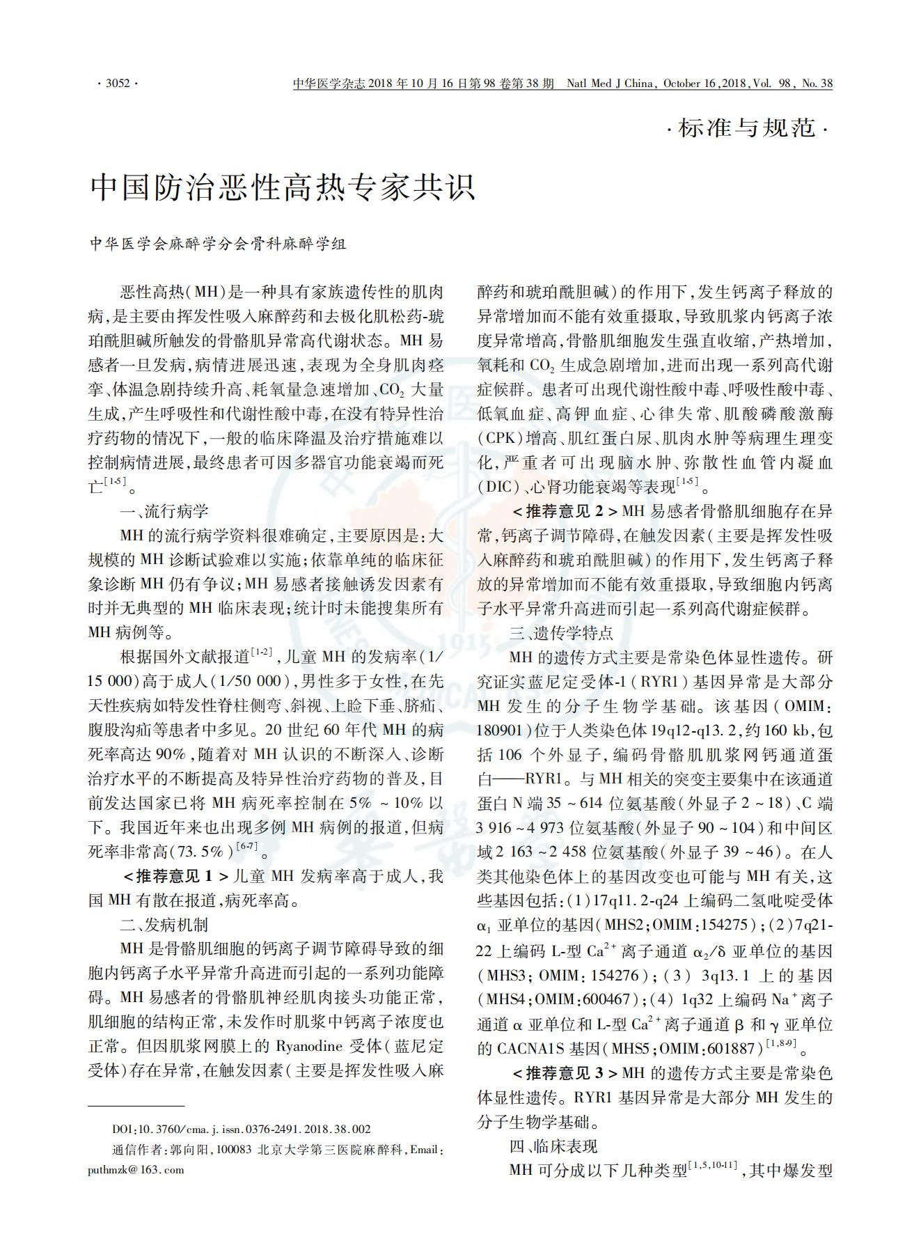 2021年中国防治恶性高热专家共识工作组在中华麻醉学杂志发表了《中国防治恶性高热专家共识(2020版)》,针对恶性高热的定义、临床表现、鉴别诊断、救治等多方面进行了阐述,为指导临床工作提供了依据...