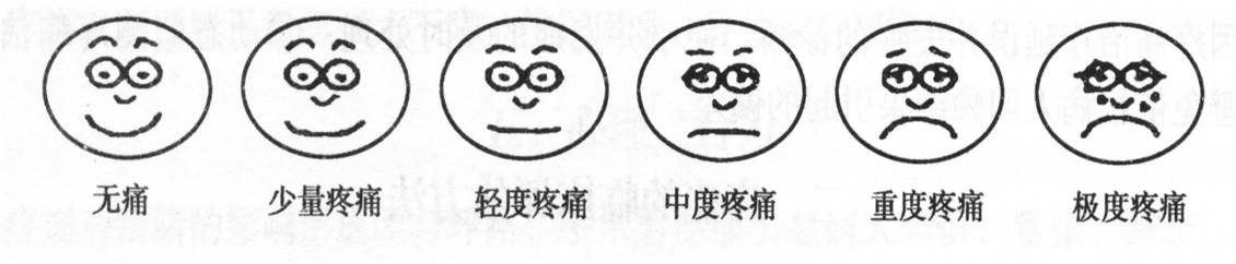 (4)Wong-Baker面部表情量表(Wong-Baker faces pain rating scale)(见下图):由六张从微笑或幸福直至流泪的不同表情的面部象形图组成,适用于交流困难、意识不清或不能用言语准确表达的老年患者。