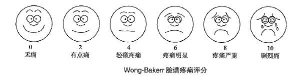 4.Wong-Baker面部表情量表(Wong-Bakerfacepainratingscale) 由六张从微笑或幸福直至流泪的不同表情的面部象形图组成。这种方法适用于儿童、老年人等交流困难、意识不清或不能用言语准确表达的患者,但易受情绪、文化、教育程度、环境等因素的影响(下图),应结合具体情况使用。
