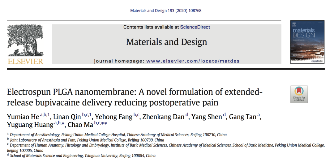 北京协和医院麻醉科黄宇光教授、2019级临床博士后贺渝淼等人于2020年8月发表于"Materials & Design"上的文章“Electrospun PLGA nanomembrane: A novel formulation of extended-release bupivacaine delivery reducing postoperative pain"影响因子:6.289