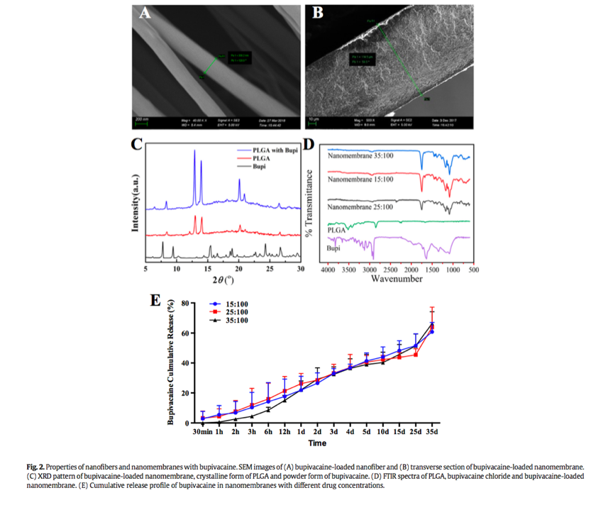 应用静电纺丝技术制作含有盐酸布比卡因的聚乙酸丙交酯(PLGA)纳米纺丝,并进一步制作成缓释膜。利用扫描电子显微镜(SEM)、X光衍射(XRD)、傅里叶变化红外光谱(FTIR)、体外释放技术探究缓释膜的材料学特性;利用大鼠行为学、电生理学探究缓释膜在大鼠术后急性痛模型中的镇痛效果;利用组织学探究缓释膜局部和系统毒性反应。