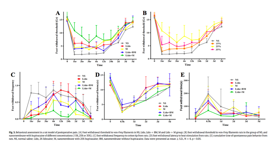 本研究制作的含有盐酸布比卡因的静电纺丝纳米缓释膜可实现超长缓释,表现出持久的镇痛效果,且不引起局部及系统毒性反应。