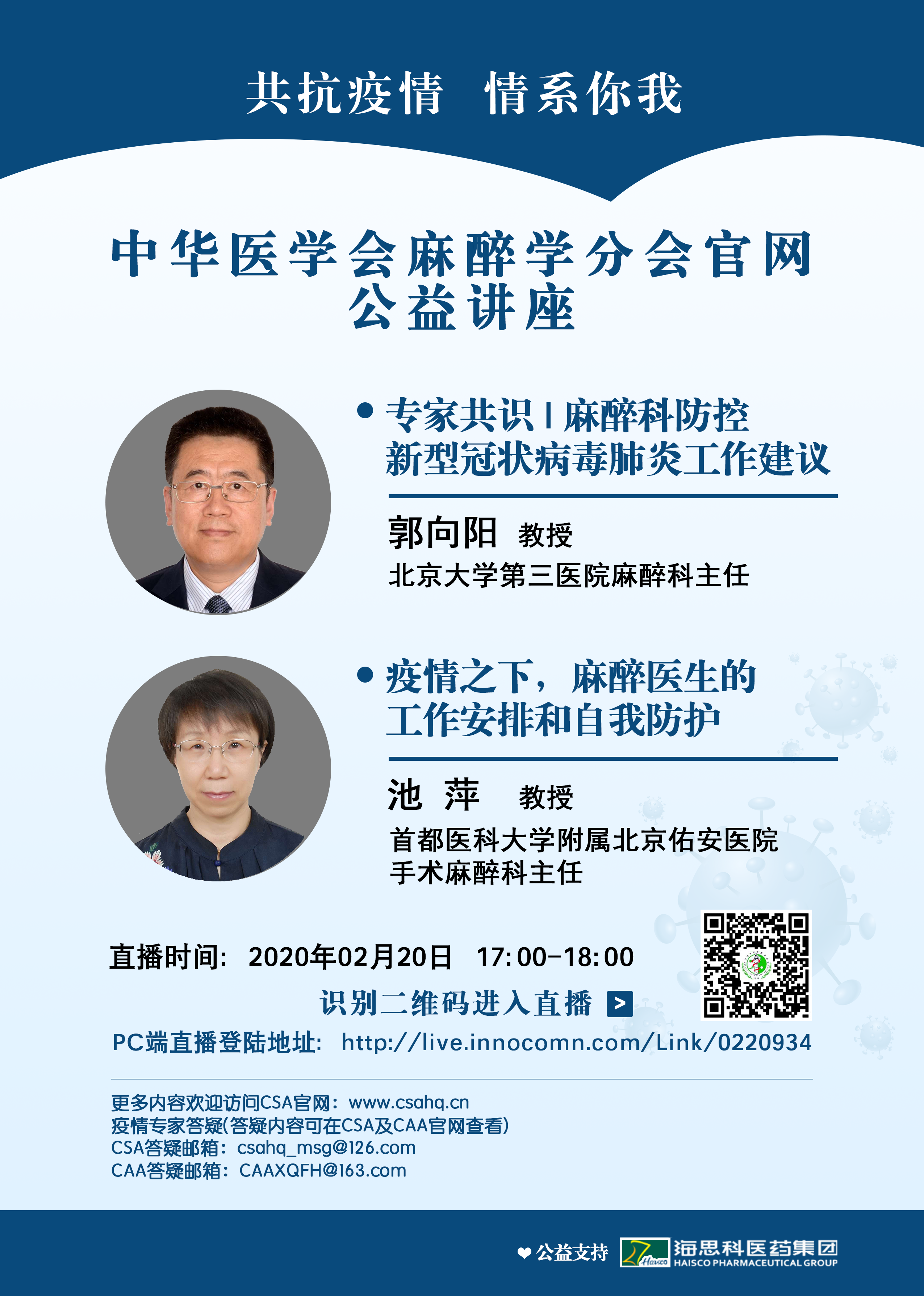 本周四(20日)由中华医学会麻醉学分会官网为大家带来专题公益讲座,让我们充分准备、科学防护、合理安排,收获这场没有硝烟的战争的最终胜利。