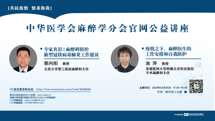 2020年2月20日17:00-18:30中华医学会麻醉学分会官网在学会的大力支持下开展了“共抗疫情,情系你我”的线上专题公益讲座。此次公益讲座荣幸的邀请到北京大学第三医院麻醉科主任郭向阳教授及首都医科大学附属北京佑安医院手术麻醉科主任池萍教授线上授课,两位经验丰富的麻醉科专家分别从麻醉科防控新型冠状病毒肺炎的专家共识及麻醉医生自我防护的角度为全国麻醉同道奉上了疫情期间的最坚实的专业支持和关爱呵护,线上观看人数达1万人次以上,反响十分热烈。