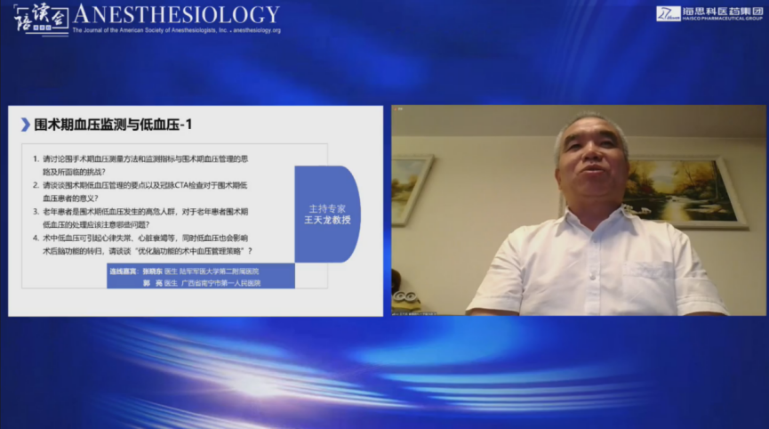 紧接着,在王天龙教授的主持下会议进入第一部分的话题讨论环节。众所周知,麻醉循环管理三要素:血压、心律/节律、组织灌注,其中血压平稳是围术期管理的核心目标。王天龙教授以“Anesthesiology中文版2019年第1期和第2期”的两篇关于血压管理的文献为切入点,围绕血压监测及术中低血压管理与在线的大咖及一线的麻醉医师讨论了以下问题:
