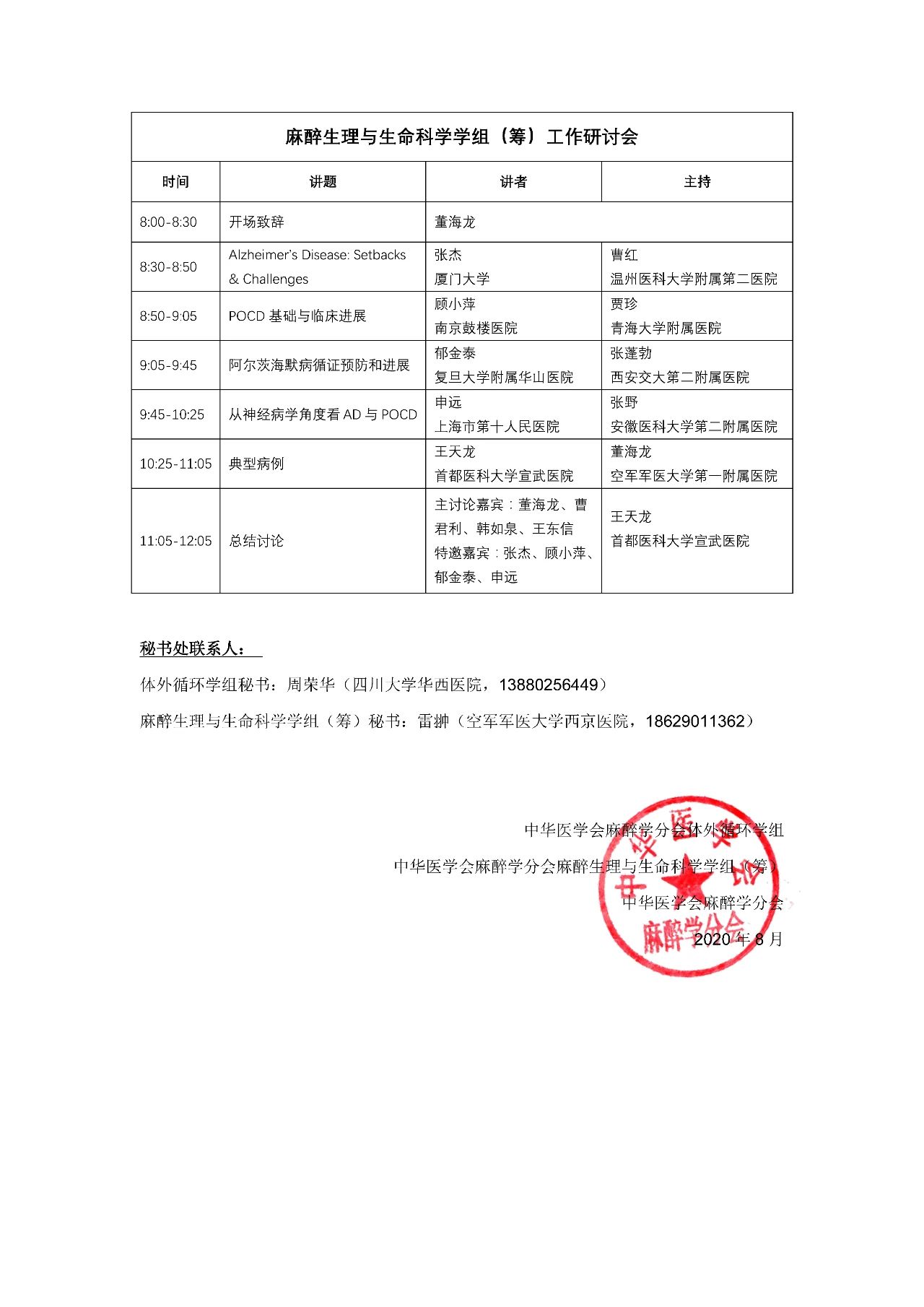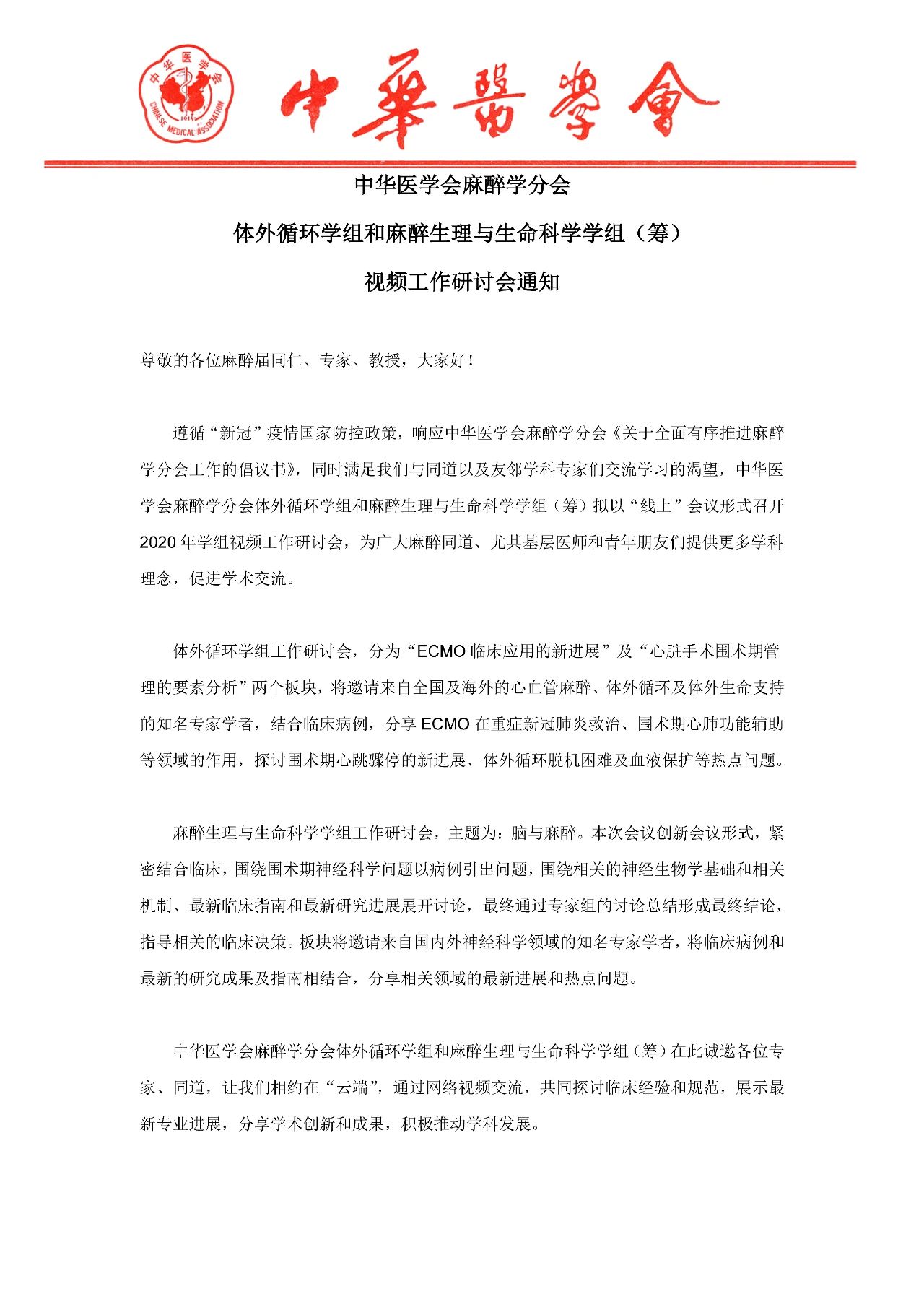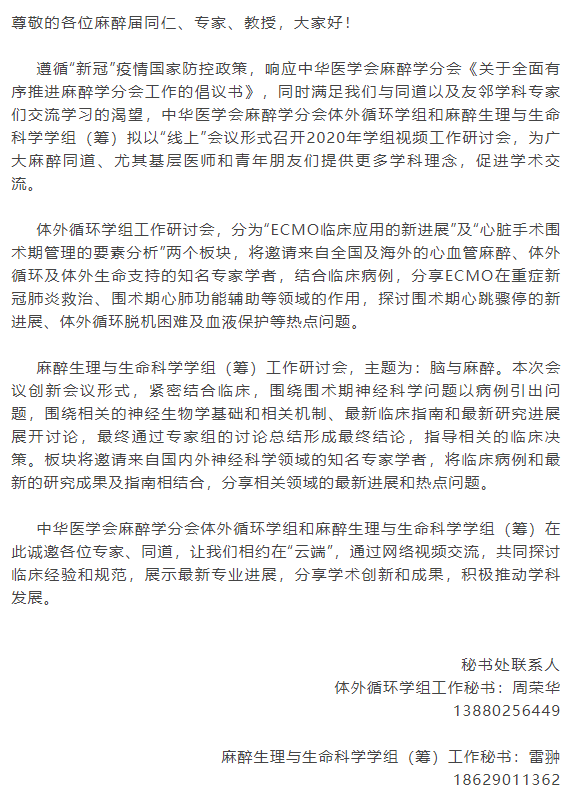 【会议通知】中华医学会麻醉学分会体外循环学组和麻醉生理与生命科学学组(筹)视频工作研讨会通知