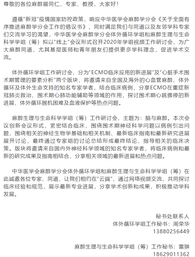 【会议通知】中华医学会麻醉学分会体外循环学组和麻醉生理与生命科学学组(筹)视频工作研讨会通知