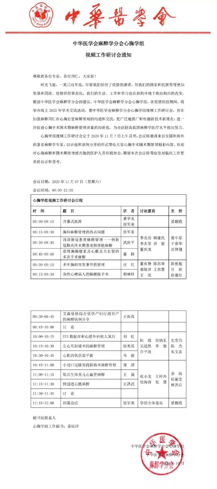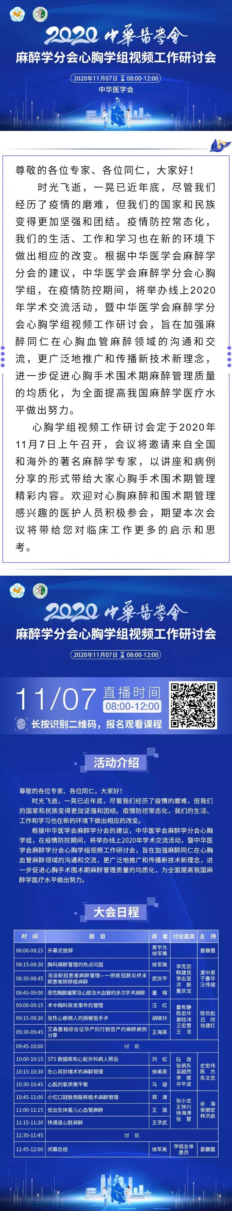 会议通知丨【中华医学会麻醉学分会心胸学组】2020年视频工作研讨会
