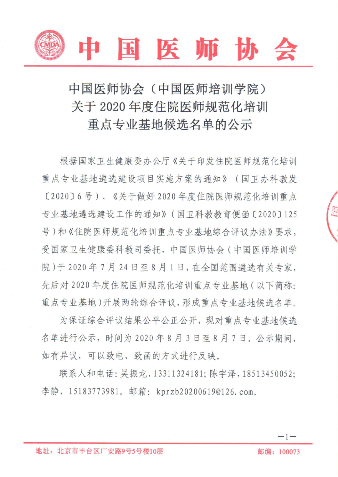 根据国家卫生健康委办公厅《关于印发住院医师规范化培训重点专业基地遴选建设项目实施方案的通知》(国卫办科教发[2020]6号)、《关于做好2020年度住院医师规范化培训重点专业基地遴选建设工作的通知》(国卫科教教育便函[2020]125号)和《住院医师规范化培训重点专业基地综合评议办法》要求,受国家卫生健康委科教司委托,中国医师协会(中国医师培训学院)于2020年7月24日至8月1日,在全国范围遴选有关专家,先后对2020年度住院医师规范化培训重点专业基地(以下简称:重点专业基地)开展两轮综合评议,形成重点专业基地候选名单。