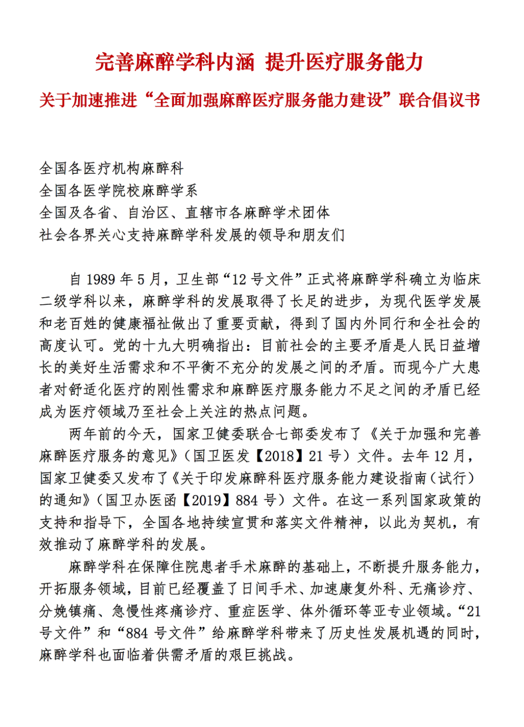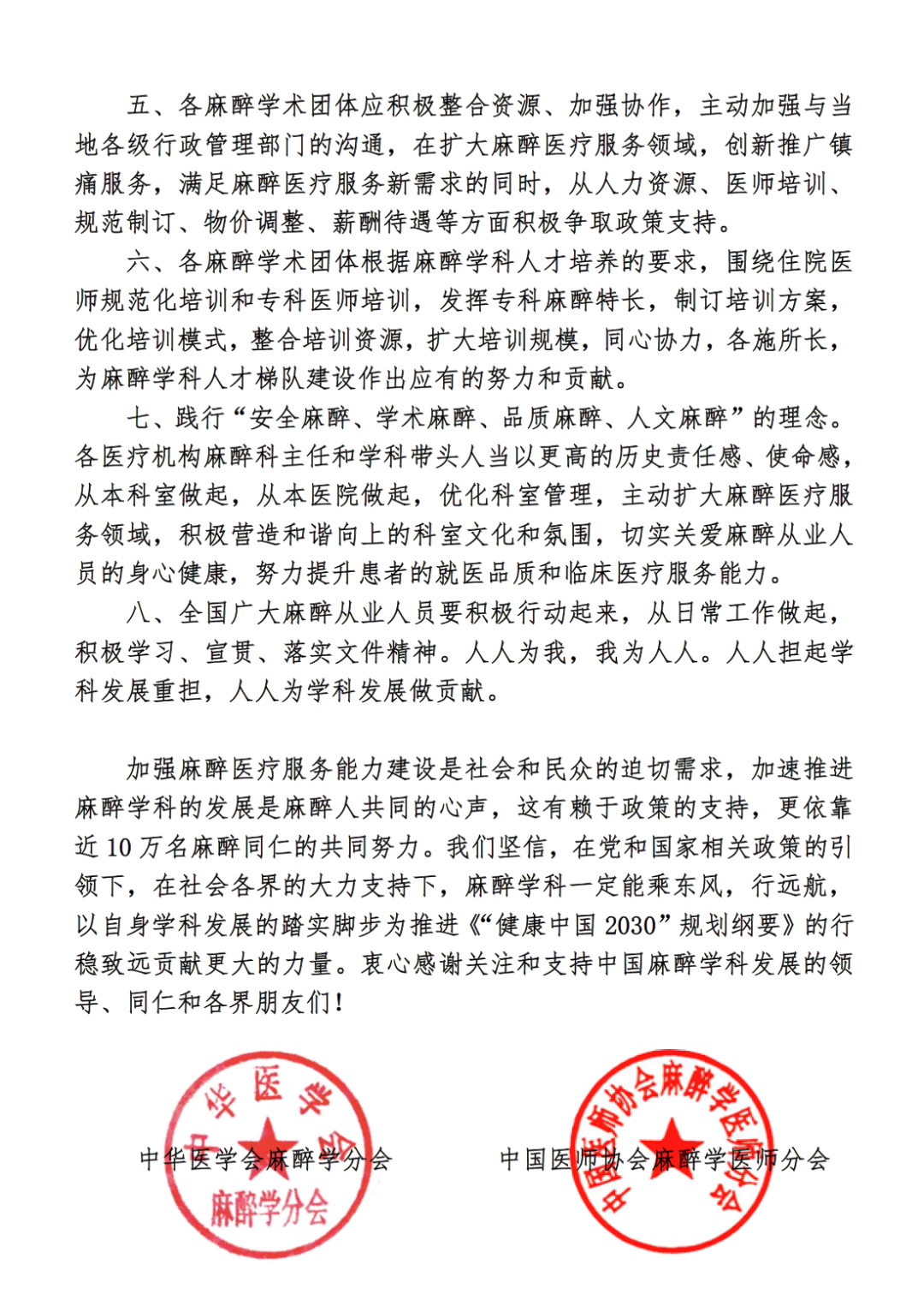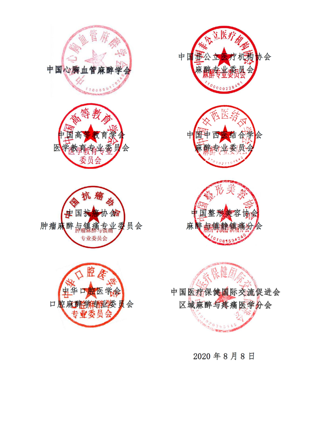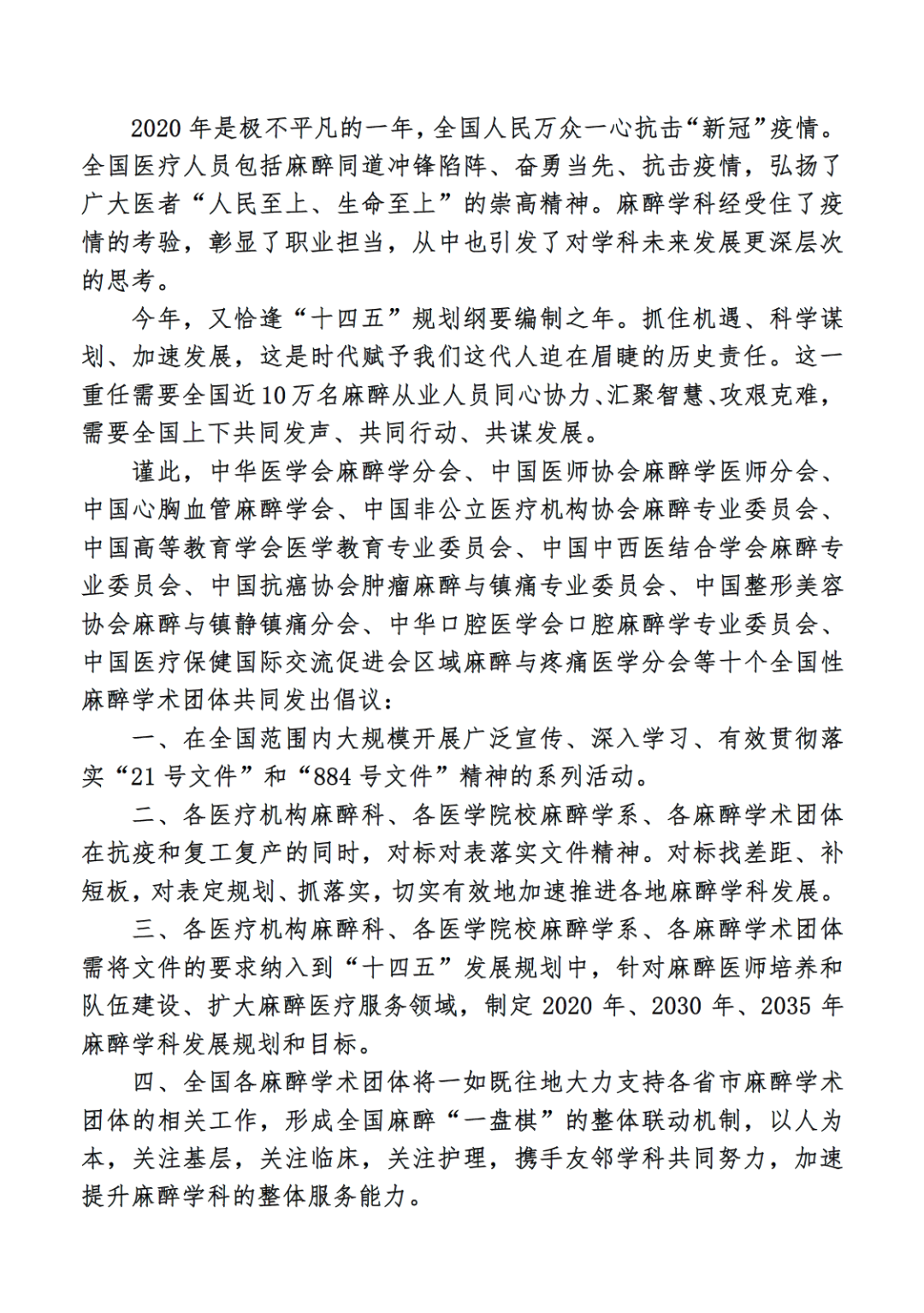 谨此,中华医学会麻醉学分会、中国医师协会麻醉学医师分会、中国心胸血管麻醉学分会、中国非公立医疗机构协会麻醉专业委员会、中国高等教育学会医学教育专业委员会、中国中西医结合学会麻醉专业委员会、中国抗癌协会肿瘤麻醉与镇痛专业委员会、中国整形美容协会麻醉与镇静镇痛分会、中华口腔医学会口腔麻醉学专业委员会、中国医疗保健国际交流促进会区域麻醉与疼痛医学分会等十个全国性麻醉学术团体共同发出倡议: