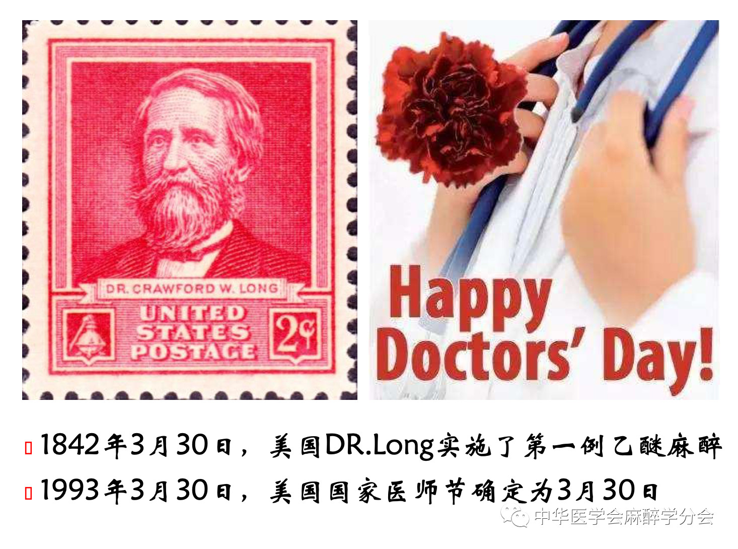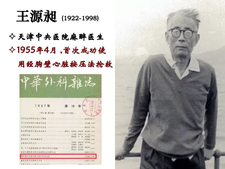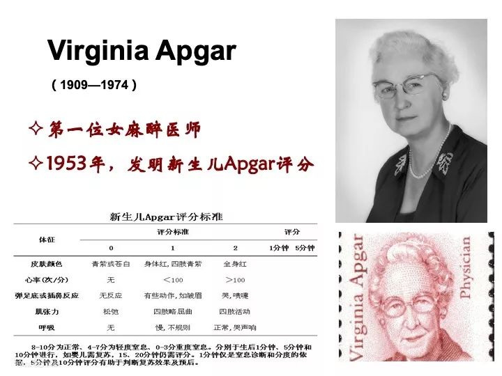 大家都知道美国有一位麻醉医生叫Dr.Long,他在1842年3月30日用乙醚进行麻醉,给患者做手术。他当时相当于一个乡村医生,也就是我们所说的赤脚医生(barefoot doctor)。他虽然最早用乙醚去做手术。但是呢,他不太写SCI文章。所以,大家都知道使用乙醚麻醉有Dr.Morton和Dr.Wells,但是对他不是很熟悉。美国最后还是把Dr.Long使用乙醚麻醉的日子定为美国医师节。应该说,麻醉同道对于现代医学的贡献是巨大的。举个例子来说,Dr. Apgar是我们全球第一位女性麻醉医师,而大家所熟知的新生儿Apgar评分就是由这位麻醉大夫提出来的。还有就是来自中国天津医科大学、我们尊敬的前辈王源昶教授,大家都知道心肺复苏技术,很多人认为CPR胸外心脏按压技术是1960年由英国的一个学者提出来的,但其实大家看这个1957年第十期的中华外科杂志,当时王源昶教授就已经报道了产妇仰卧位低血压综合症导致的心跳骤停,进行了CPR心脏按压,成功的抢救了患者生命。可惜的是,当时我们英文的交流不足,未能得到国外的同道的及时了解和认可,但是他仍然是我们中国乃至医学界的骄傲。