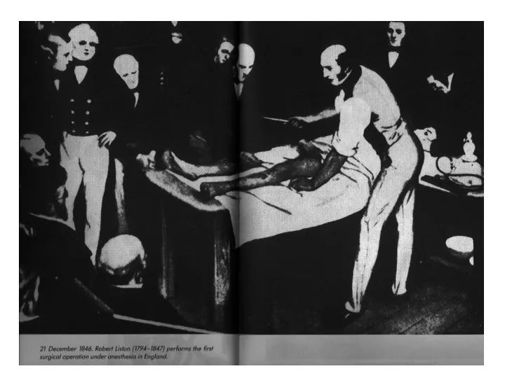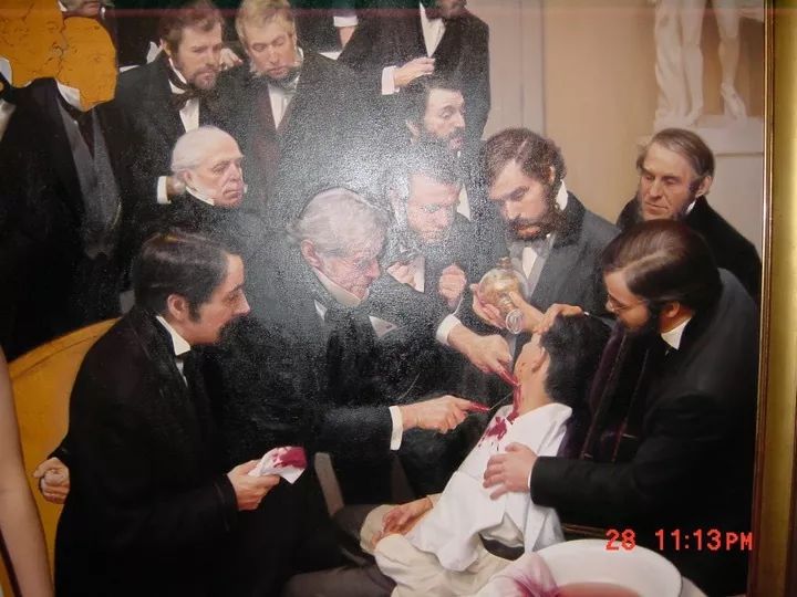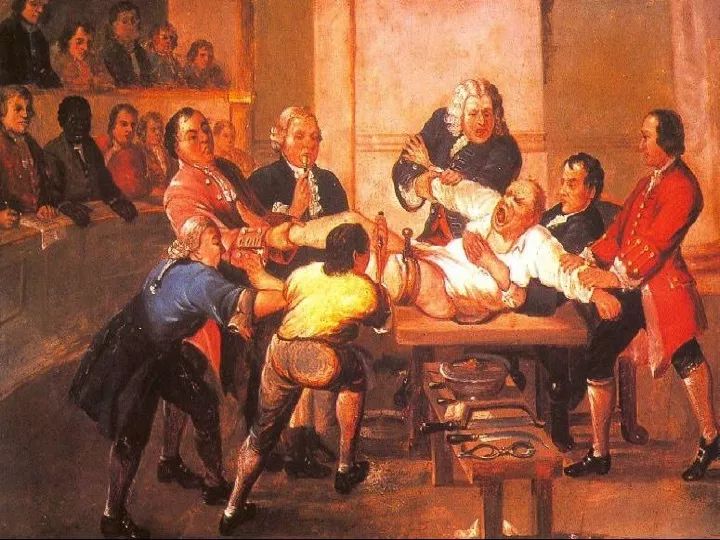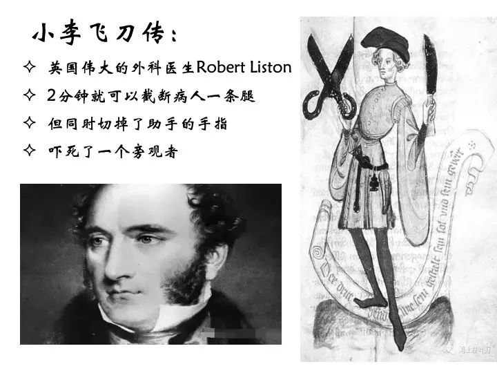 人类文明几千年,医学的发展带来了医疗的文明。在麻醉技术诞生之前,当时要给一个患者做一个截肢,需要靠这样几个彪形大汉把他逮住,彪形大汉的主要作用就是不能让患者跑掉。而当时的外科大夫一定是“心狠手辣”,你看这位手术医生的长相就非常的“彪悍有力”。这位外科医生叫Robert Liston,当时他有一个外号叫“小李飞刀”,他是英国伟大的外科医生。他可以在两分钟之内把患者的下肢给截掉,但是由于过于匆忙,史传有一次他把助手的手指头也给切掉了,然后还把周围一位围观者吓死了,助手由于手指感染也牺牲了。所以没有麻醉的手术无异于一种酷刑。