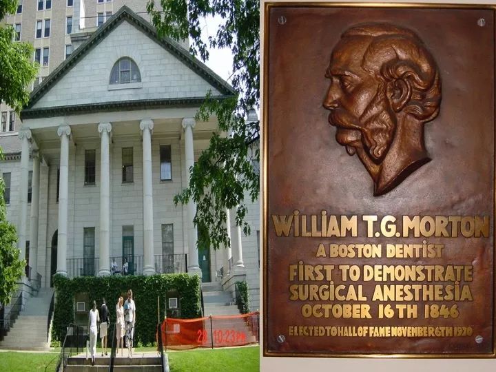 1626年左右发现了乙醚,但是到1846年才真正的用于临床,当时的麻醉就像一个剃头匠一样,没有任何监测,没有安全可言。Dr.Wells曾经在美国的麻省总医院演示乙醚麻醉的拔牙手术。一不小心麻醉不够深,一操作病人疼痛难忍,更大的错误是当时他没把病人逮住,病人跑掉了,所以在那么严谨的高等学府,他就被当成骗子赶出了手术大厅。一直到Dr. William Morton,他是波士顿的一个牙科大夫,1846年10月16号他成功的在这个乙醚大厅演示了乙醚麻醉下的小手术。而这个麻醉手术就成为我们现代麻醉学的一个里程碑。我们终于有办法让患者在手术过程中,相对没有那么痛苦。虽然当时的麻醉并不那么完美,我们当时去看这个乙醚大厅,是如此的坚固,隔音效果非常之好。据说当时患者不住在里面,是做手术的当天把患者从别的地方送到这个大厅里面去,等病人接受手术的时候再后悔就来不及了。