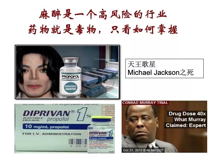 没有麻醉医生的麻醉是非常危险的,我们都知道这位是Michael Jackson,这位是他的家庭医生,Michael很有钱,雇的家庭医生是一位心血管大夫。俄罗斯总统普京雇的贴身医生则是一位麻醉大夫。所以可以想象,Michael用propofol的时候,如果他雇佣的医生是我们在座的麻醉大夫的话,可能时至今日他依然活跃在摇滚乐的舞台上。