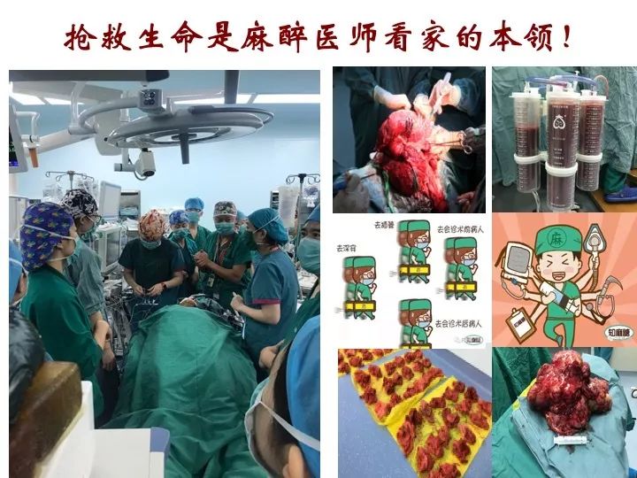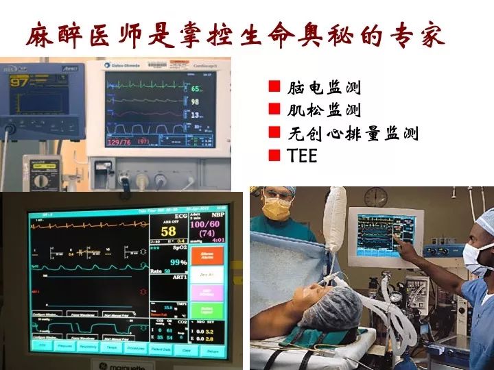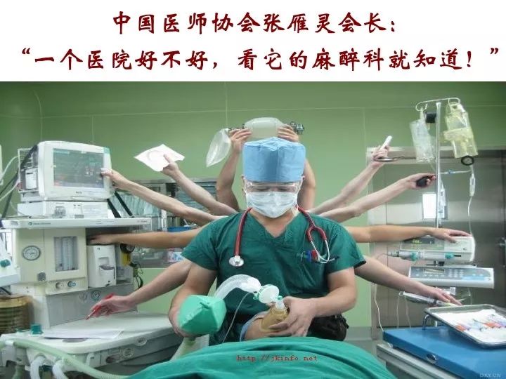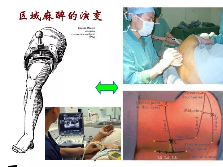 这两张图片鲜明的展示了19世纪的麻醉与今天的麻醉之间的差异,19世纪的麻醉是一个开放式的乙醚吸入,今天我们可以做把控输注,把病人的年龄、体重输入微电脑,设定一个靶控浓度,输注泵就可以安全的运行,我们叫它靶控输注(Target controlled infusion)。再看我们的区域麻醉,原来是上一个紧箍咒,让下肢缺血,然后截肢。如今我们用神经刺激器和超声定位的方法,可以精准的对单个肢体进行阻滞,而对全身没有影响。而且现在的麻醉医生需要具备内外妇儿以及病理学、生理学、药理学等等相关学科知识。麻醉医生是全科医生,是外科领域中的内科医生,所以从这个角度应该说作为麻醉大夫,我们是值得骄傲的,我们应该被社会所认可,应该被百姓熟知,并且从事麻醉工作应该是很有成就感的。