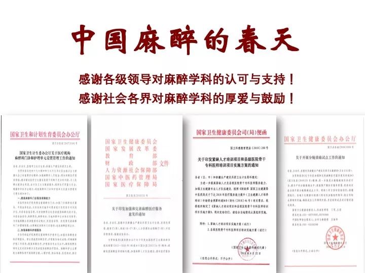 原来的非手术科室对麻醉科的需求也越来越多,这让我们的麻醉医生负担沉重,疲劳驾驶,刚性需求无法满足。但我们庆幸的是我们国家的领导人,我们的国家卫生健康委在去年发布了七部委的红头文件。我们的麻醉春天已经到来,因为在过去的11个月当中,四项红头文件针对一个临床学科,它就是:麻醉科。