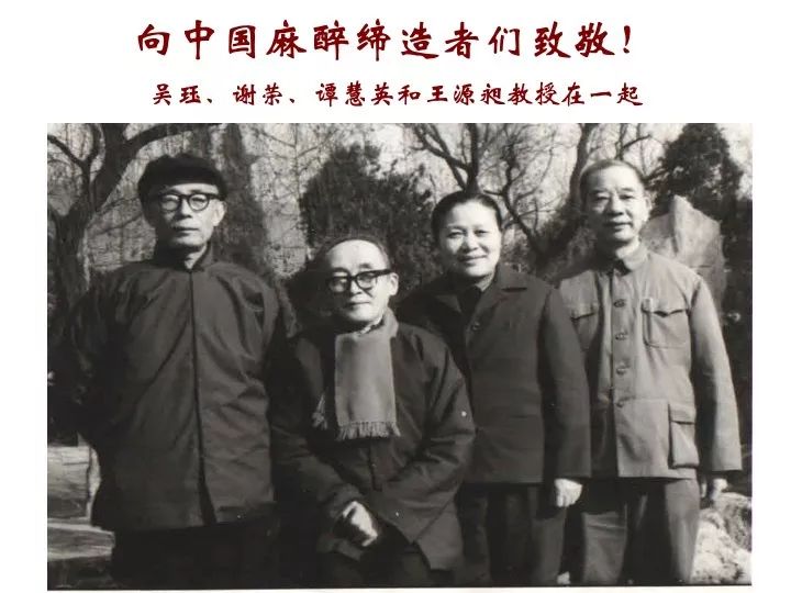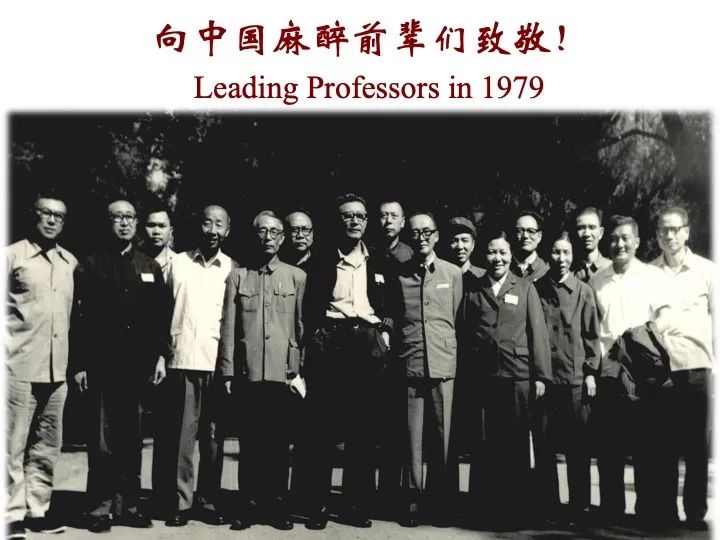 大任之下,我们要传承要创新。饮水思源,我代表我们在座的包括我们全体的麻醉界同道,要向中国麻醉的缔造者们表示我们的敬意。这是一张40年前的老照片,其中尚德延教授第一任主任委员、还有吴珏教授、谢荣教授,还有一大批的顶级专家,正是他们的艰苦奋斗给我们今天的持续提高带来了的可能。而今天,我们应该尊老爱幼,向金大鹏会长要求的那样勇于担当,勤于思考,团结一致,不断的去把我们的学科做的越来越好。