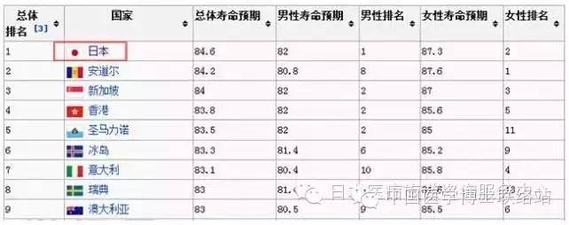 世界卫生组织(WTO)发布的2015年版《世界卫生统计》报告显示,2014年日本女性的平均寿命为86.83岁,男性为80.50岁,均刷新了历史最高记录。日本人的平均寿命连续20多年位居世界第一。