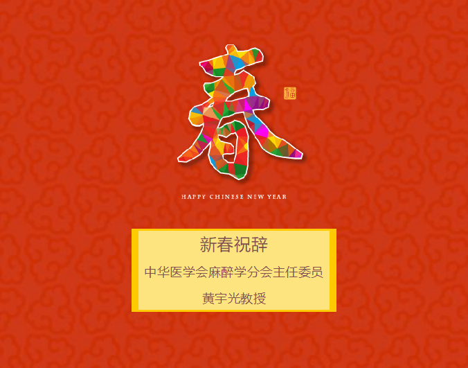 On the Occasion of the Spring Festival of Chinese Year of the Pig, the Chinese Society of Anesthesiology (CSA) would like to express its heartfelt gratitude and blessings to anesthesiologists across China and around the world. We send our sincere greetings and respect to those who are still working during the festival and have devoted in the past.