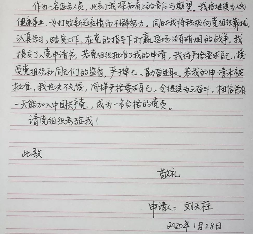 在我加入发热门诊一线工作的第三天,经过深思熟虑,我郑重地向麻醉科党支部递交我的入党申请书。