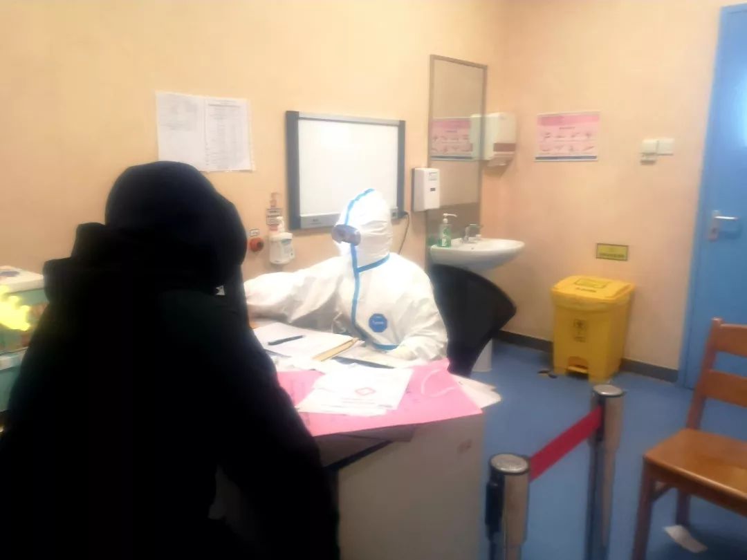 (↑↑↑发热门诊隔离门里认真工作的徐卉主任医师)