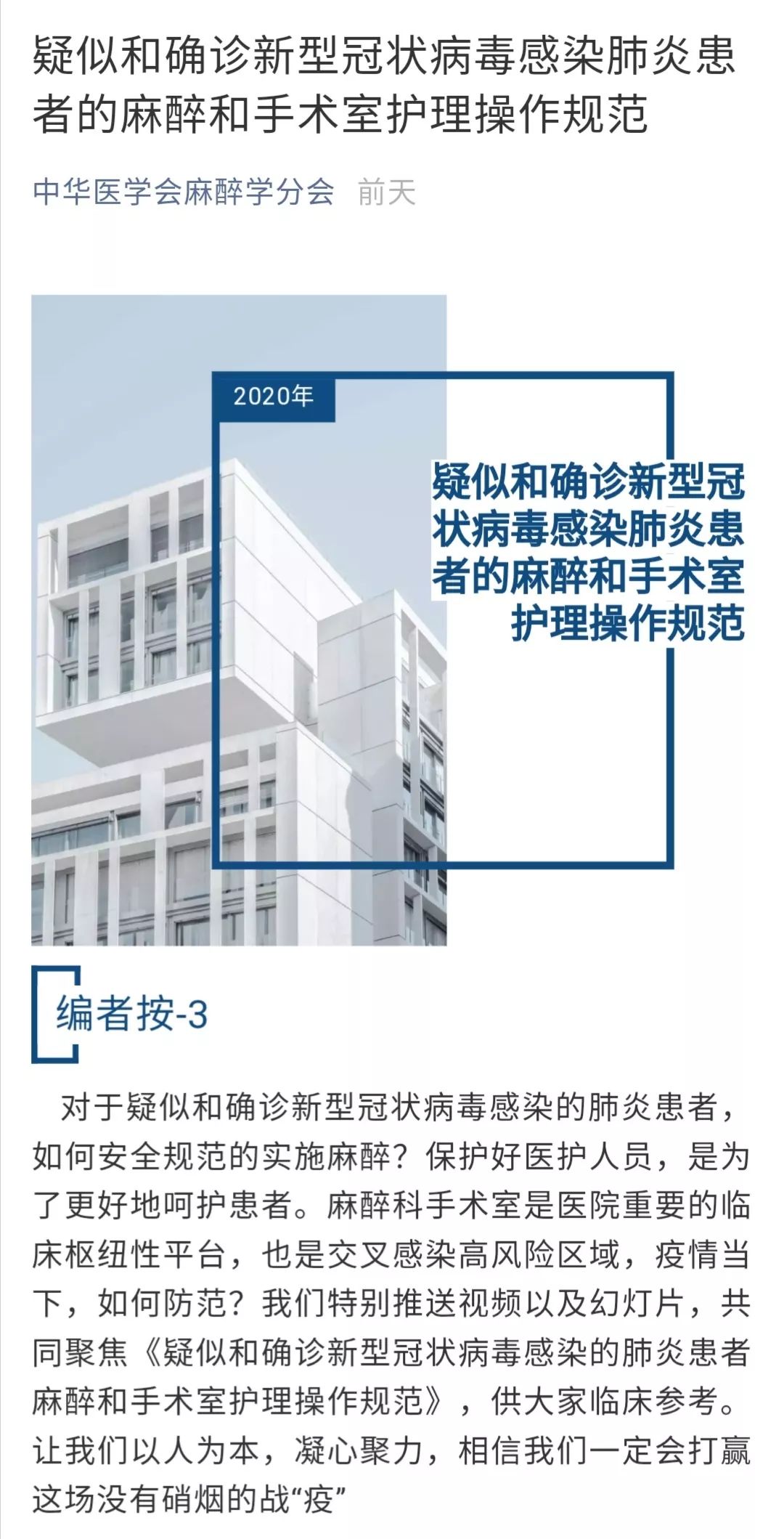 1月29日,《规范》文字版首次在“中华医学会麻醉学分会”微信公众号发布;2月1日, 《规范》配套视频也在“中华医学会麻醉学分会”微信公众号发布。截至2月5日,累计阅读量已达8万余次。《规范》的第一时间发布,既展现了北京协和医院的专业引领,又体现了学会和国家级质控中心的使命担当,让全国麻醉科手术室医护同道明确了职业操作规范和防护措施,一定程度上缓解了一线医护人员的心理压力。