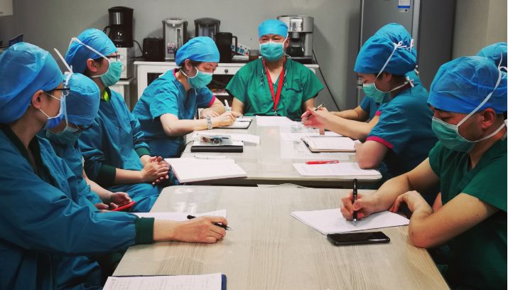 ▲1月31日,麻醉科手术室召开抗击新型冠状病毒感染的肺炎疫情专题核心组会议