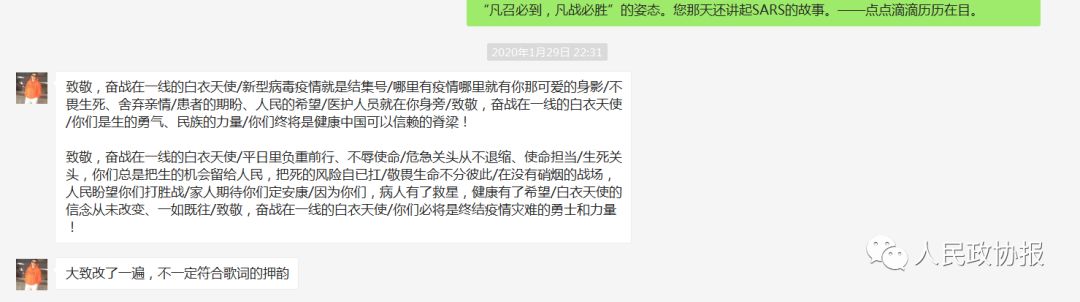 之后,笔者又特别邀约了全国政协委员、北京协和医院麻醉科主任黄宇光参与修订。一段时间以来,黄委员正为杀医事件屡屡发生而关切并曾在第一时间为医务人员发声,而在此次大的疫情面前,这位曾经在十多年前参战SARS抗疫的老兵毅然在奔赴抗疫前线的后补医生名单上签字,表示“随时听召”。问及,他淡然回答,“这是医生的天职。相信绝大多数医生都会做出这样的选择。”黄委员连夜参与了歌词的修订,也借以表达了医界的心声。他说,“病毒当前,舍我其谁?还是那句话,‘国有战,召必回,战必胜’,医生群体永远是健康中国的脊梁!”