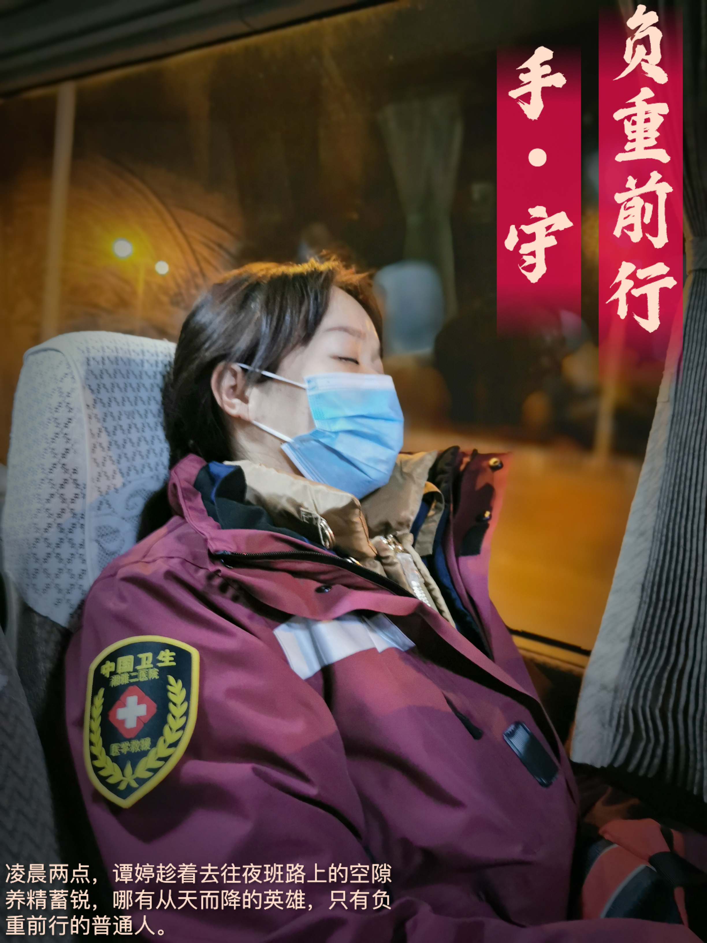 凌晨三四点的长沙下着淅淅沥沥的小雨,气温只有零摄氏度。城市还在酣睡,而她们依然在外楼廊守护着整个病房。早上下班,双手已经冻得麻木,脸上也被口罩和护目镜压伤了。她们却只是笑着说,没事,明天就会好了。寒冷的晚风吹不散我们滚烫的斗志,繁重的工作击不退我们必胜的信心。