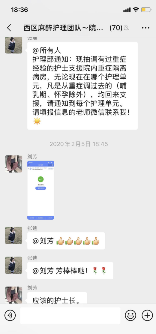 疫情伊始,张迪护士长立刻建立院感知识宣讲群,每日传达关于新冠肺炎相关文件,搜集相关防控文章,将最新的防控知识传达给每名护理人员。