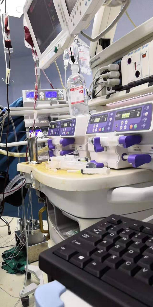 时间回到25日凌晨,几乎在同一时间,他们接到了心脏外科和心血管外科的急诊手术通知,一位61岁的女性患者和一位70岁的男性患者都因为患主动脉夹层需要马上开胸手术。心脏手术是一个需要众多团队精密合作的手术,一台手术不但需要众多手术人员的参与,而且手术耗时长。时间就是生命,来不及多想整个心外手术部立刻进入紧张忙碌而又有条不紊的围术期准备中。麻醉医生丁刘欣,巡迴护师李津已火速前往心外监护的护士那里接病人,科主任毛晓亲自带领年轻的麻醉医生张舵和冯涛开始一系列麻醉前准备,负责体外循环的郑军、刘寅森、李俊霞和张仲芹医生已装好了体外循环机在手术间待命。护士长王君璐带领主管护师王云、苏圣婴和孙德礼进行物品、药品的准备。患者一入手术间,迅速开始建立动静脉通路,精准麻醉。17点30分,61岁的患者张春平在胡振东、彭冉及周家旺团队的精准手术和心外手术部同志们的努力配合下完美收关,循环平稳,血气正常,安全送回心外重症监护室。此时,另一位70岁的老人赵东志还在十三手术间经历生与死的考验。由于患者年龄偏大,心包压塞,术前应用阿斯匹林等抗凝药,老人术中的内环境很难调控,循环不稳,出血难止,此时一点点的差错就是人命关天大事。毛主任和同志们细心管理,一点点纠正,血管外科主任赵璐洋、李连冲、赵戈锋手术团队浴血奋战,终于在26日凌晨零点30分把患者平稳送回心外重症监护室。