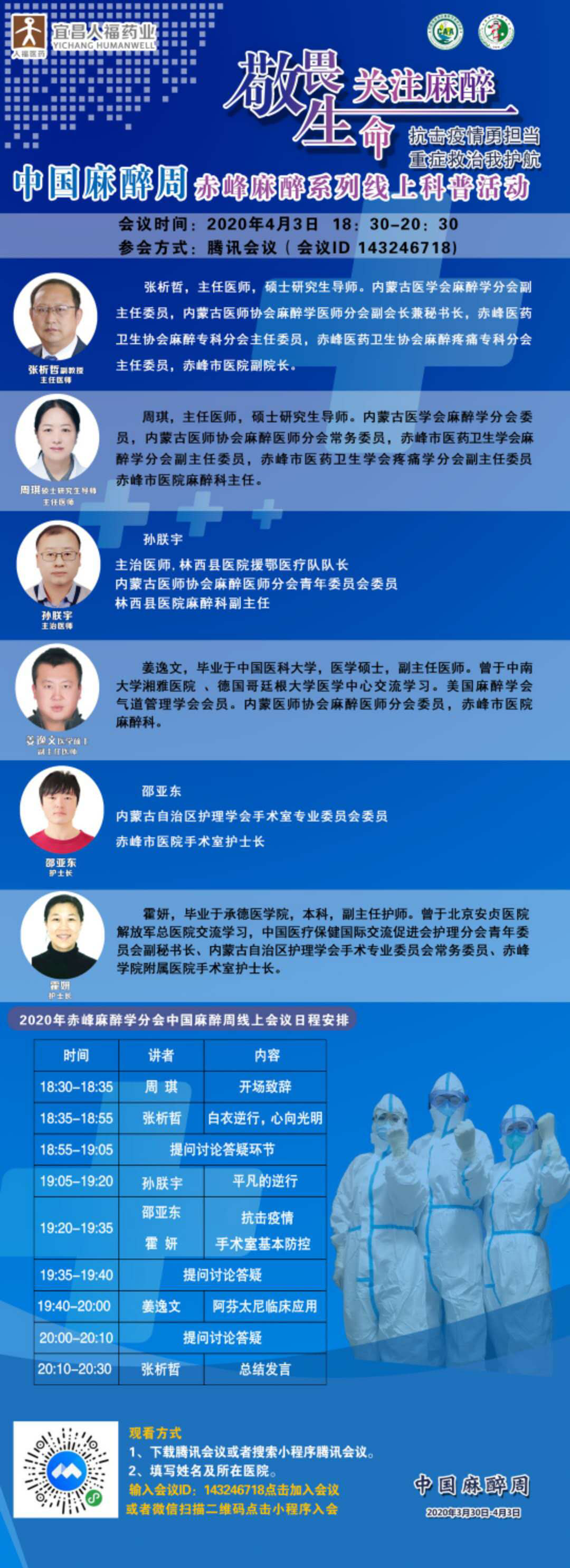 佩的是,在支援武汉的内蒙古医疗队中,就有我们麻醉医生,其中包括赤峰市医院副院长张析哲、林西县医院麻醉科副主任孙朕宇等,为此,由赤峰市医院主办,开展了《2020年赤峰麻醉学分会中国麻醉周线上会议》,近百名麻醉医生参加了会议。会议主要分享了张院长、孙主任在武汉抗击疫情期间的救治患者的经历以及对麻醉科今后发展方向进行了讨论,让我们深刻认识到作为新时代的麻醉医生,承担的责任会越来越重,需要不断自我学习更新,适应时代发展,路漫漫其修远兮,吾将上下而求索。