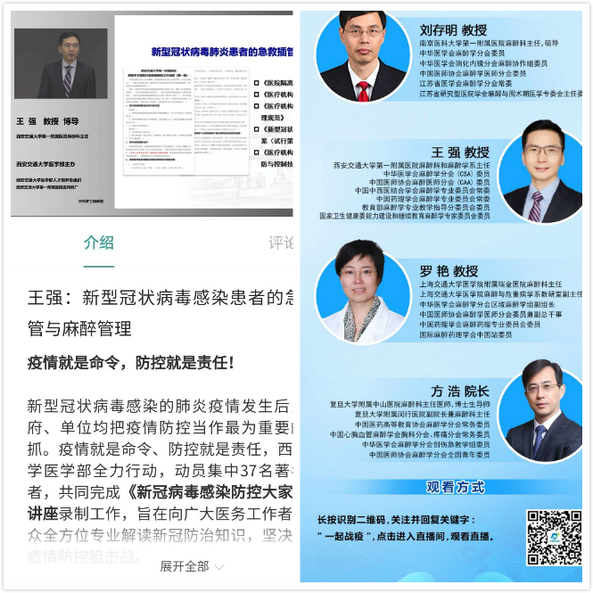 历史经验告诉我们,抗疫必将是一场“党领导人民的斗争”。 西安交通大学第一附属医院麻醉科的王强主任和盖毅文书记带领科室全体党员通过医院“企业微信”进行了线上防疫专题组织生活会,学习中央有关防疫抗疫的文件精神,武装党员的精神面貌和知识储备。王强主任更代表麻醉手术部参加录制“西交疫情大家谈”和“麻醉大咖共话”,在 “人民卫生出版社MOOC课程” 和 “壹生”等平台上线,帮助医务工作者全面高效的了解防控相关知识,帮助普通居民提高对疾病的认识。