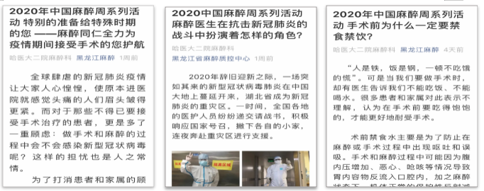 通过黑龙江麻醉和黑龙江省麻醉质控中心两个微信公众号,哈医大二院麻醉科推送麻醉科普文章,包括抗击新冠肺炎疫情期间接受麻醉的患者及医务人员的防护措施,对于疑似患者、确诊患者及普通患者的麻醉流程,降低手术患者及其家属对于感染新冠病毒的顾虑和恐惧,使患者及家属更加安心。将公众号二维码张贴在手术室患者通道和家属等候区。