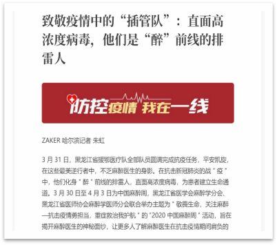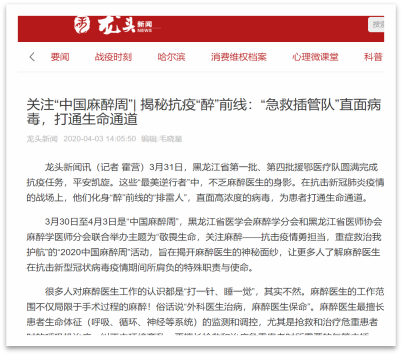龙头新闻和ZAKER哈尔滨两家新闻媒体对哈医大二院的“中国麻醉周活动”进行了报道。龙头新闻刊登了题目为《关注“中国麻醉周”—揭秘抗疫“醉前线”:“急救插管队”直面病毒打通生命通道》的文章,ZAKER哈尔滨刊登文章《致敬疫情中的“插管队”:直面高浓度病毒,他们是“醉”前线的排雷人》,向民众宣传了麻醉医生在抗击疫情的战斗中扮演的角色和肩负的使命。