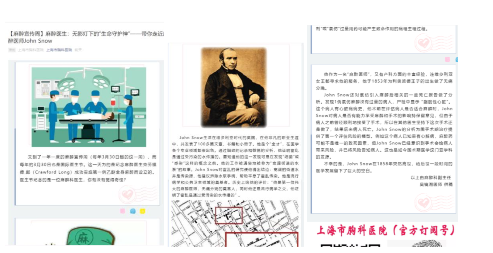肿瘤医院,仁济医院,瑞金医院,第九人民医院,胸科医院,第一人民医院,长海医院,长征医院,华东医院,新华医院、同仁医院、同济医院,东方肝胆医院,眼耳鼻喉科医院,嘉定区妇幼保健医院,肺科医院,上海曙光医院等众多沪上医疗单位还通过医院和或科室的公众号等官媒和微信平台等进行大量的线上报道,扩大麻醉科普宣传的受众群体,也获得了更广泛的宣传效果。