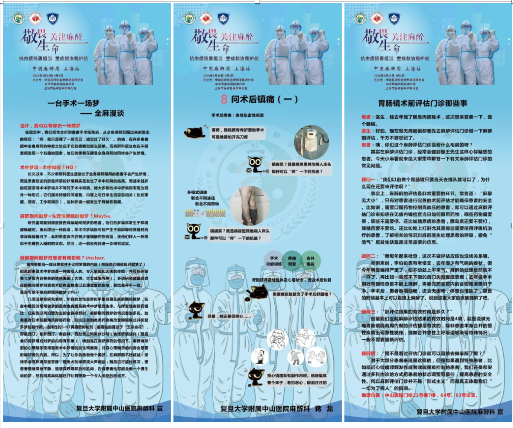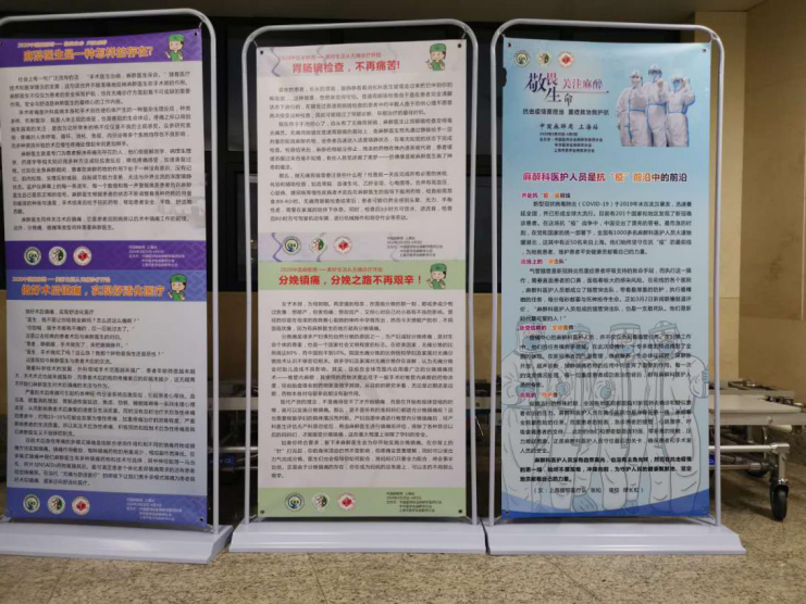 2020年注定是个令人印象深刻一年,有太多的不幸,也有太多的不平凡。在这不一样的日子里,尤其在为期一周(2020年3月30日-4月3日)“中国麻醉周”,沪上各级医院麻醉医护人员谨循主题“敬畏生命,关注麻醉--抗击疫情勇担当,重症救治我护航”,在上海医学会麻醉科专科分会统一策划下的“中国麻醉周上海站“系列活动在沪上超过100家医疗机构内如火如荼的展开,各医院麻醉科也进行了一系列的宣传推广活动,为学科发展和壮大实实在在作出了上海麻醉人的实践与贡献。复旦大学附属中山医院麻醉科在科主任缪长虹教授的带领下,在门诊大厅及手术患者家属等候区开展了一系列公益宣传活动,旨在让更多的患者、家属和其他医务人员对麻醉医学专业有更深入的认知和认可,普及临床麻醉、危重症救治及疼痛治疗的相关知识,了解麻醉学科的临床工作内容,认识到麻醉、镇痛及围术期管理对于患者短期及长期预后的重要影响,进而认识到现在麻醉学正逐步向围术期医学发展并贯穿于整个舒适化医疗的过程中。仁济,长海,瑞金等沪上知名大医院麻醉科在科室主任带领下,就无痛分娩、无痛人流、无痛胃肠镜、无痛纤维支气管镜和无痛康复治疗等麻醉相关舒适化技术,为广大患者和家属进行了一系列科普教育。各院从麻醉的由来,临床麻醉工作类型,麻醉科工作范畴,麻醉科门诊,术前评估,麻醉治疗,麻醉风险,无痛内镜,无痛分娩,围手术期注意事项,术后疼痛,以及麻醉药物对于智力的影响等众多患者、家属及社会非常关心的话题与疑问等向患者及其家属等娓娓道来,热情宣讲麻醉科普,传播麻醉科学知识,提高社会对于麻醉学科的认可程度。