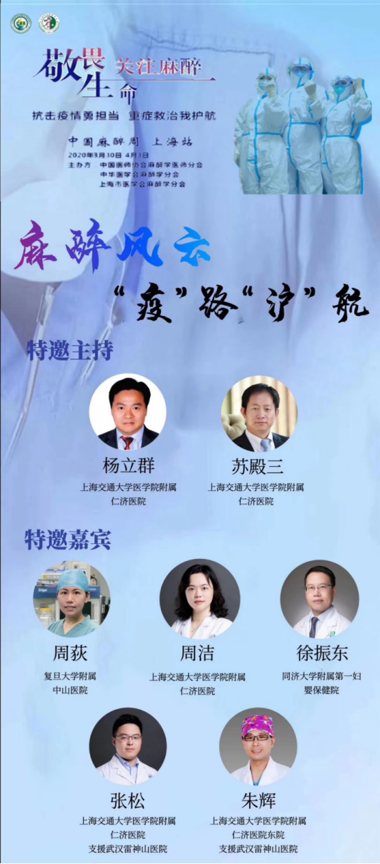 由学会精心制作的3套包含麻醉学科基本知识和社会对于临床麻醉关切问题的麻醉科科普活动宣传海报一经发到沪上100多家各级医院和诊所的麻醉科,在这些医院的门诊大厅,麻醉科或手术患者家属等待区域,以及疼痛诊疗区域等重要场所就进行展示。胸科医院在医院微信公众号上做了麻醉科普小故事,讲述了麻醉医生斯诺与“乙醚麻醉原理”,“无痛分娩”,“霍乱流行病学”等的故事,“古麻今醉网”科普了丹麦麻醉医师比约易卜生和“重症监护室”、“血气分析”、“呼吸发明”的故事。虽然由于特殊疫情防控的要求,各家医院麻醉科主任和各级麻醉医师不能像往年那样,与面对直接患者,和或其家属,以及人民群众进行宣传,但线上科普推广活动进行得如火如荼。结合今年麻醉周主题,长海医院麻醉学部于3月29日晚举行了一次特别的战“疫”交流会,云端连线自除夕夜至今依然奋战在武汉抗疫一线的学部6位医护人员,与科室同事交流工作和生活状况。上海医学会学会麻醉分会联合《围术期医学论坛》于4月3日举行了名为“麻醉风云,疫路沪航”的中国麻醉周上海站专题公开课。由仁济医院杨立群和苏殿三两位教授主持,中山医院周荻教授、仁济医院周洁教授和一妇婴徐振东教授分别就无痛胃肠镜、日间手术及无痛分娩做了专题演讲,同时,在“致敬英雄,诉说衷肠”版块,会议连线了上海援鄂医疗队奋战在雷神山医院的朱辉教授和张松博士,他们代表沪上支援武汉抗疫一线的勇士,讲述了在鄂工作的前沿战况,一个个感人泪下的故事让活动进入了高潮。本次公开课收获近万次的点击率,也是本次上海站活动的一个热点。九院麻醉团队在姜虹主任的带领下,就口腔舒适化麻醉、整形美容麻醉、危重症急救、疼痛治疗以及新冠肺炎防治等热点话题进行了细致入微的讲授和指导,参与人数众多,现场气氛十分热烈。