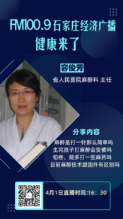 容俊芳教授通过石家庄市电视台录播了“直击手术室-走进神秘麻醉科”,并将视频剪辑挂在医院外网进行宣传;参加了“FM100.9石家庄经济广播健康来了”节目,在节目中针对大众所关心的“麻醉是打一针那么简单吗”,“生完孩子打麻醉会变傻吗”等诸多问题进行了详细解答,直播期间节目收到了热情关注。