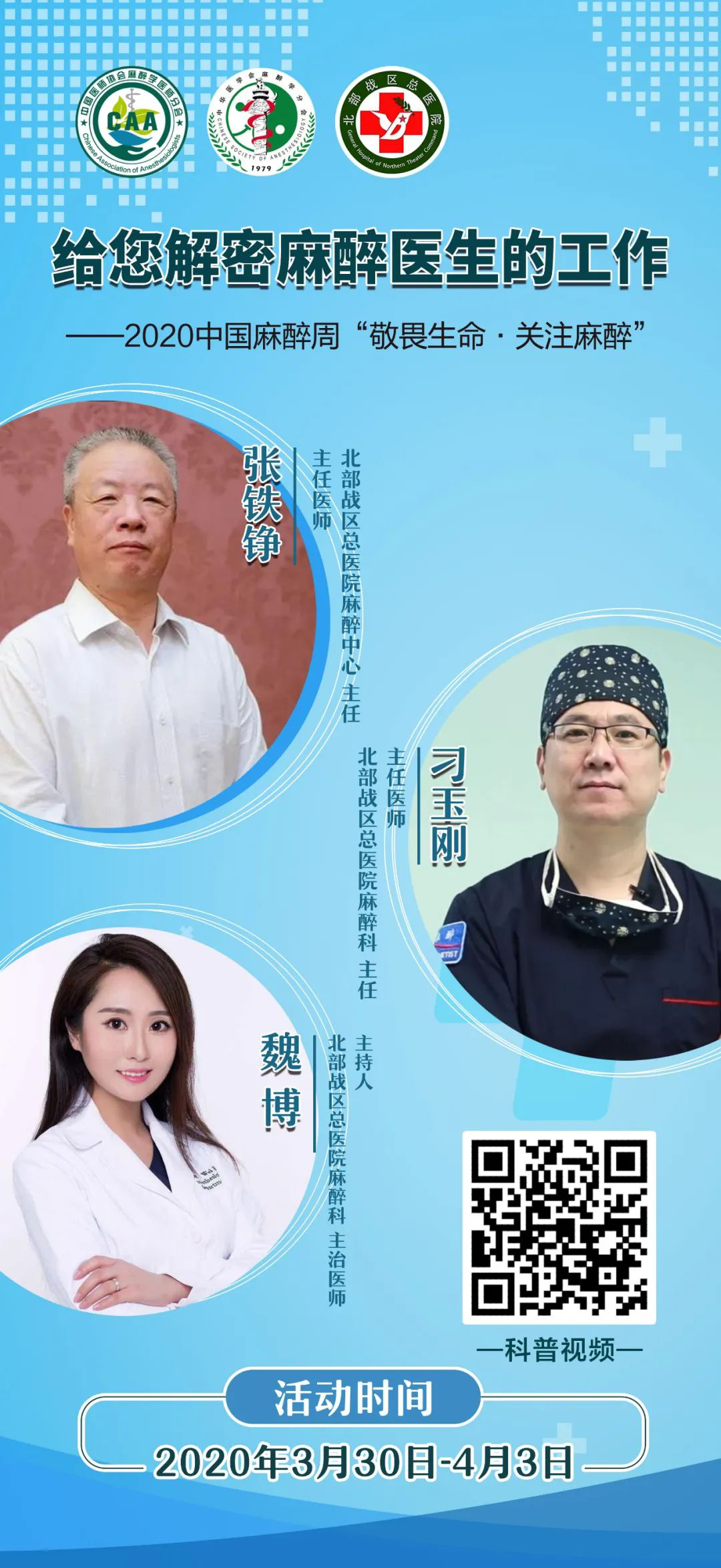 2020年3月30日至4月3日是第四届中国麻醉周,今年的主题为“敬畏生命,关注麻醉------抗击疫情勇担当,重症救治我护航“。为响应中华医学会麻醉学分会和中国医师学会麻醉学医师分会的活动号召,在疫情期间更广泛地宣传麻醉学相关知识,提高公众对麻醉学科的认知度。3月30日,北部战区总医院麻醉科在门诊六楼日间手术中心举行了“中国麻醉周”宣传义诊活动启动仪式,并开展了丰富多彩的线上线下科普宣传和学术活动。