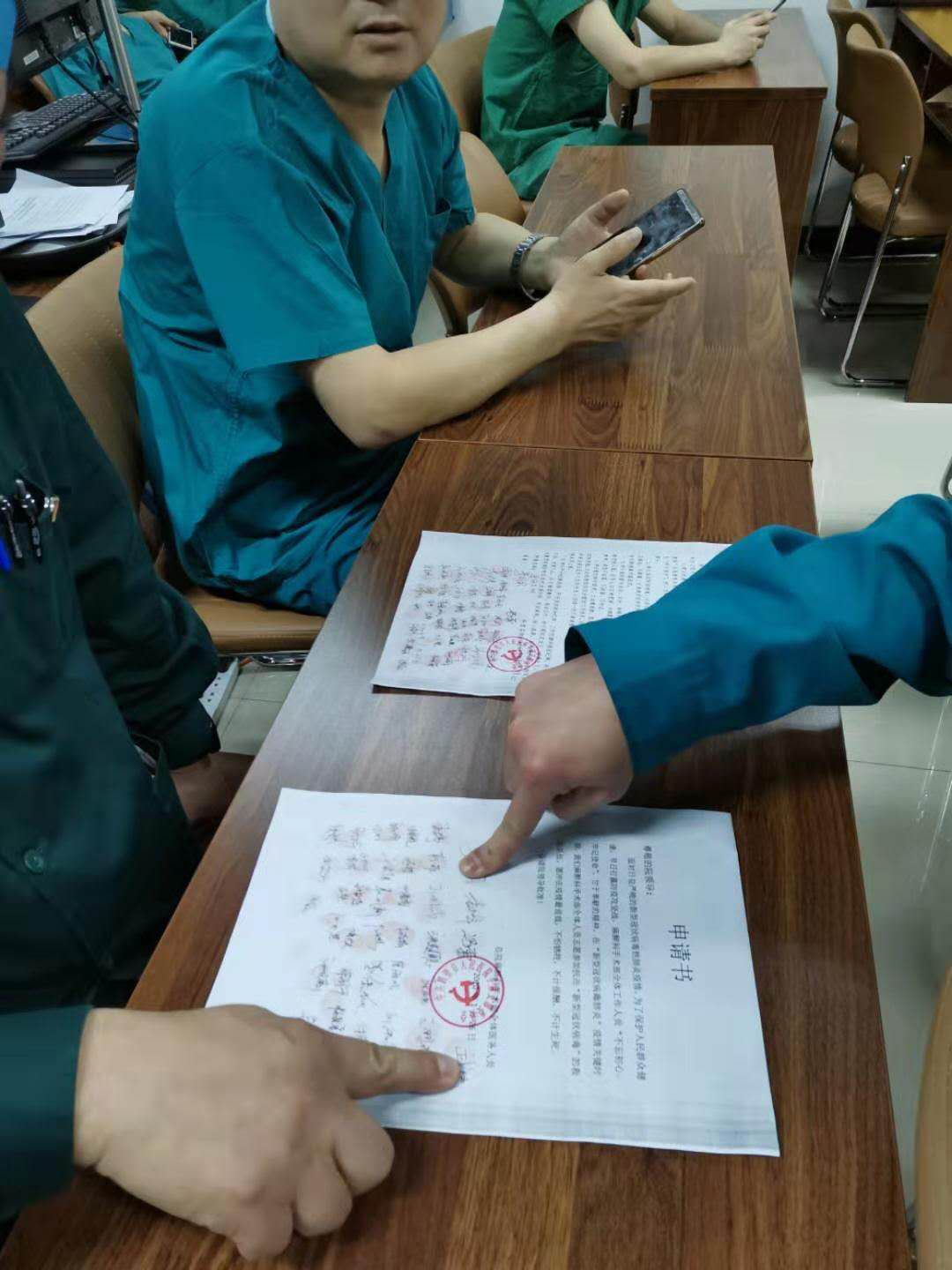 在接到抗疫命令后,麻醉手术中心针对此次疫情,收集资料,成立科室抗击新冠病毒应急管理小组,制定各类工作制度及流程,同时组织科室医生及护士进行新冠肺炎及传染病的相关知识学习。手术室是防疫重地,在疫情期间,为保证手术安全,几乎每台手术,科主任都亲自把关指导。麻醉手术中心作为医院重点部门,全体人员坚守岗位时刻准备着。大家在抗疫请战书上签名请战。