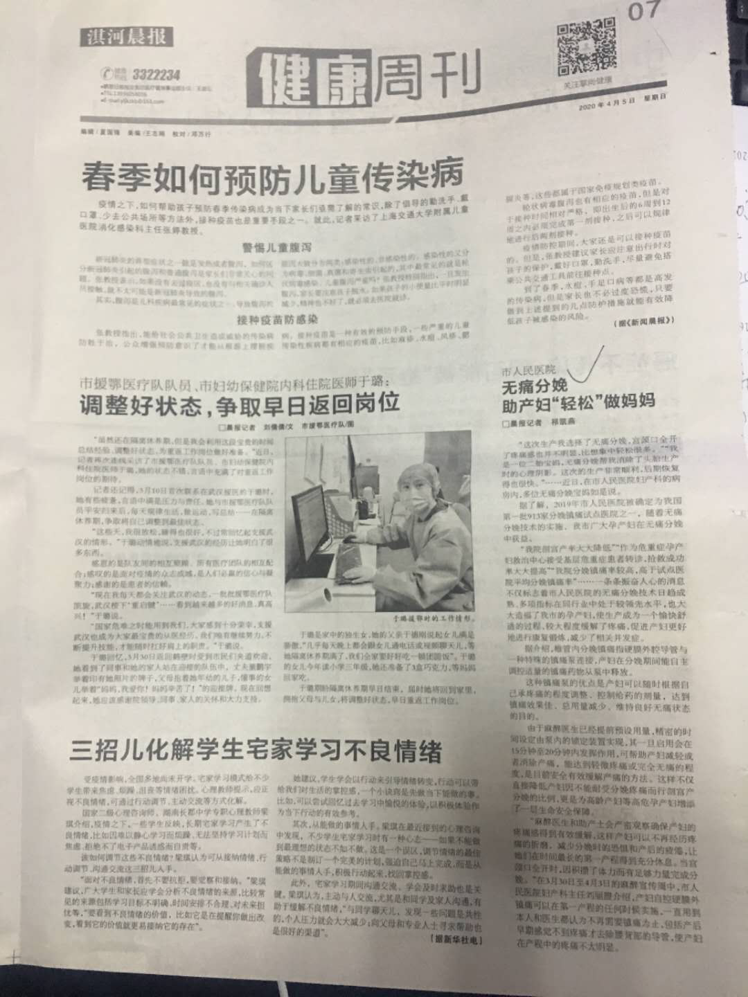 在麻醉宣传周期间,我们对围术期管理的重要性以及医院的无痛分娩技术和无痛肠胃镜的业务做了进一步及宣传,鹤壁市淇滨晨报:健康周刊栏目也对其进行了报道。并在科室门口进行宣传发放资料。